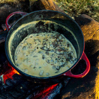 Skjær sopp i biter og stek i gryte med smør og bacon.