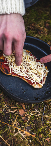1) Bruk hendene til å forme en klump av deigen til en rund pizza. 2) Stek kun den ene siden av pizzaen i en smurt stekepanne. 3) Ta panna av bålet, og snu pizzaen med den nystekte siden opp. Ta på saus, kjøtt og ost etter eget ønske. (Tips: Stek kjøttet i forkant for å unngå brent pizzabunn) 4) Plasser pizzaen tilbake i panna og dekk til med lokk for å skape nok varme til å smelte osten. Stek pizzaen til osten har smeltet. 5) Dryss på mer topping for fyldigere smak. Bon apetitt.