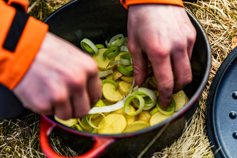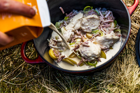 1. Skjær poteter, purreløk og skinke i terninger. Ha det i en gryte.