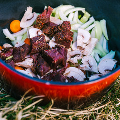 Skjær løk, hvitløk, gulrot og sellerirot i biter. Fres i gryte på bålet.